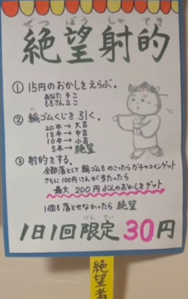 モモカフェオリジナルのラストは、「絶望射的」。今回紹介するギャンブルの中では最もハイリスク・ハイリターン。1日1回限定、30円で挑戦できて長く楽しめます♬