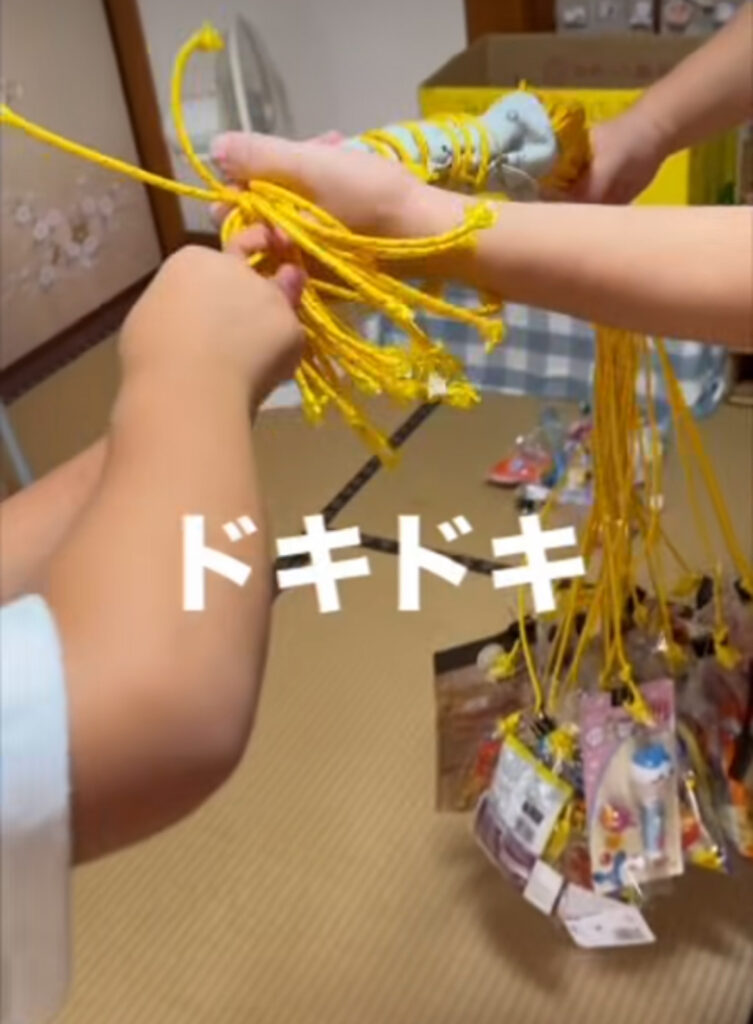 次に紹介するのは、「ひもくじ」。こちらは100円で挑戦できて、お菓子やおもちゃが当たります。
